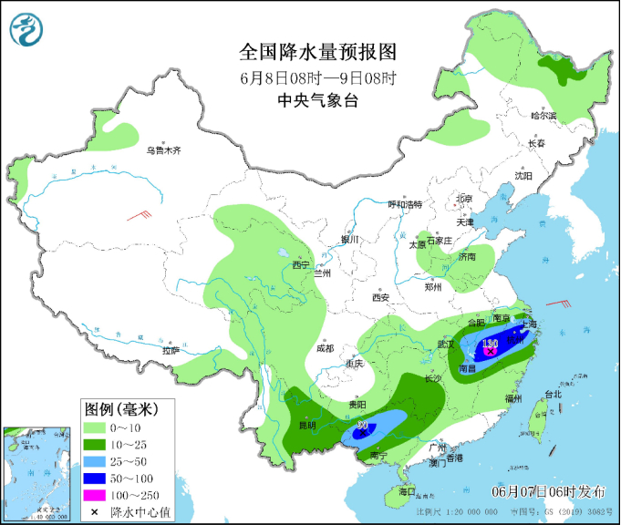 中央气象台今晨继续发布暴雨蓝色预警:预计今天,湖北东部和南部、安徽中南部、江苏南部、上海、湖南西部和北部、江西北部、浙江西部和北部、贵州东部和南部、广西西北部等地部分地区有大到暴雨,其中,江苏南部等局地有大暴雨(100~150毫米)。上述部分地区伴有短时强降水(最大小时降雨量30~60毫米,局地可超过80毫米),局地有雷暴大风等强对流天气。