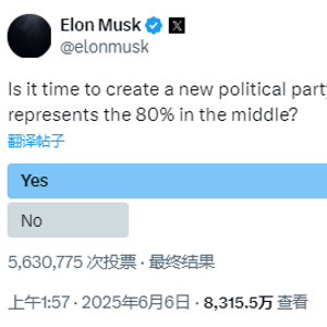美东时间周四,在特朗普与马斯克骂战正酣之际,马斯克在社交平台X上发起了一项民意调查,询问“这个国家是否需要一个实际代表80%中间阶层利益的新政党”。而调查结果显示,超过80%的投票者都选择“是”。