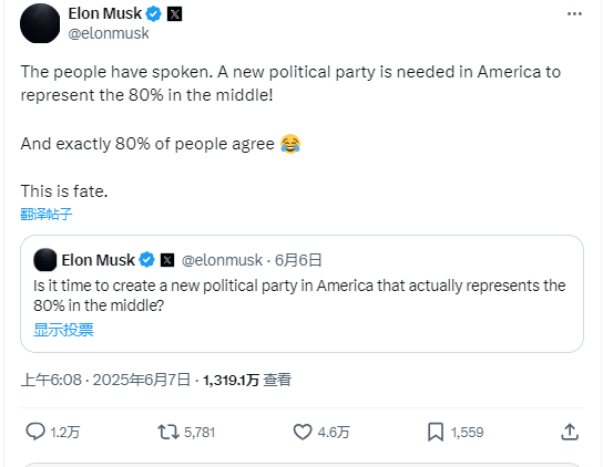 “人民已经发声。美国需要一个新的政党来代表80%的中间阶层!正好80%的人同意。这就是命运,”马斯克周五引用他的调查数据写道。