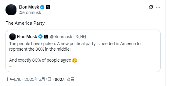 财联社6月7日讯(编辑 刘蕊)美东时间周五,美国总统特朗普和首富马斯克的骂战又有了“新剧情”——马斯克在X上声称,他计划要成立一个新的政党——“美国党(the America Party)”。