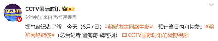 据央视新闻,当地时间6月7日上午,朝鲜首都平壤的网络一度中断。据悉,是技术原因导致中断。目前网络依然不时中断,技术调试仍在持续。据CCTV国际时讯,预计当日内可恢复。
