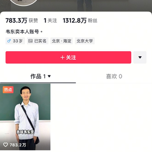 6月7日上午11时许,发布首条视频一天后,韦东奕账号粉丝已经突破1300万,其首条视频点赞量已经突破780万。