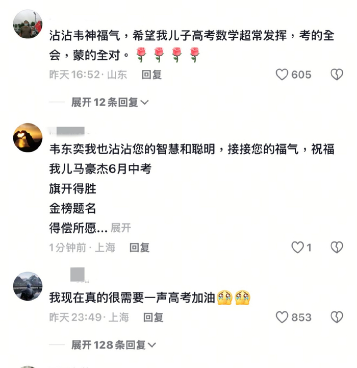 韦东奕抖音账号评论区化身“高考许愿池”