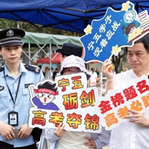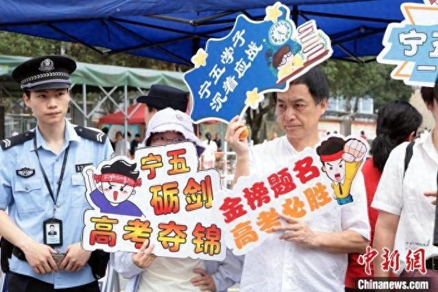在宁德五中考点,有老师举着精心制作的“旗开得胜、逢考必过”“考的全会,蒙的全对”“为梦而战、冲刺高考”等祝福标语,也有家长身穿大红色的国潮印花短袖,还有家长身穿旗袍,给考生和孩子送上满满的祝福。