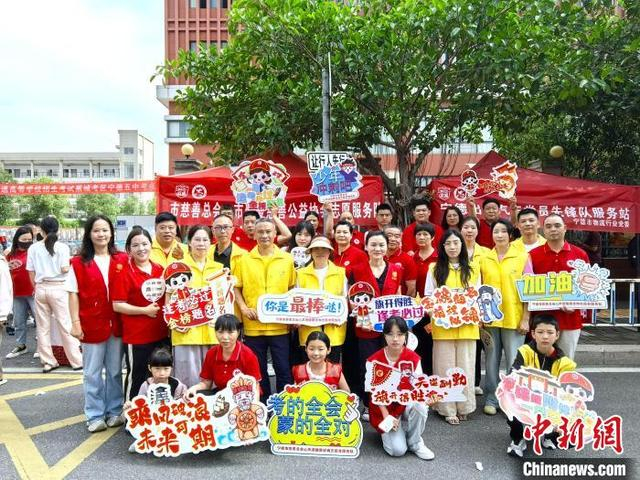 6月7日,2025年全国高考拉开序幕,福建省宁德市2.1万余考生奔赴考场。图为宁德市慈善总会的志愿者们为考生们送上温暖的祝福。林榕生 摄