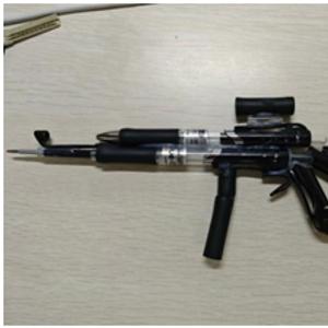 “所谓‘笔枪’,就是利用中性笔的笔身、笔尖、弹簧等零件,经过拆解与组装,制成类似枪支造型且能弹射的玩具。”