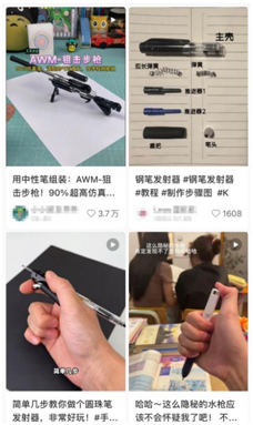 记者在某短视频平台以“用中性笔做一把枪”为关键词进行搜索,搜索结果里热度最高的视频点赞量高达40多万,评论过万条。这类视频大多冠以“创意手工”“自制玩具”“手工DIY”等标签。