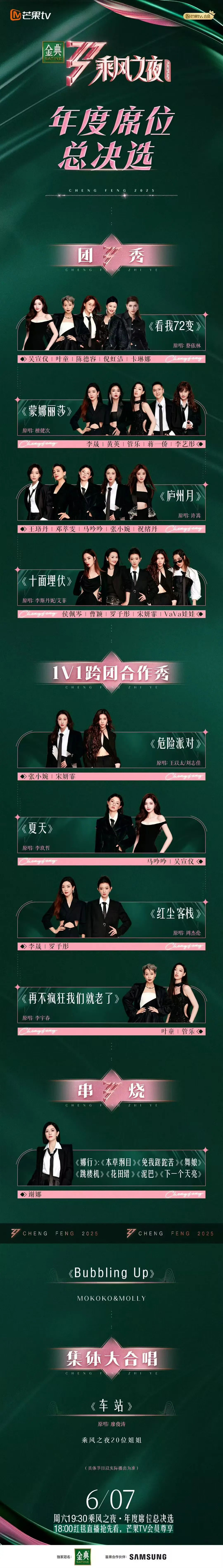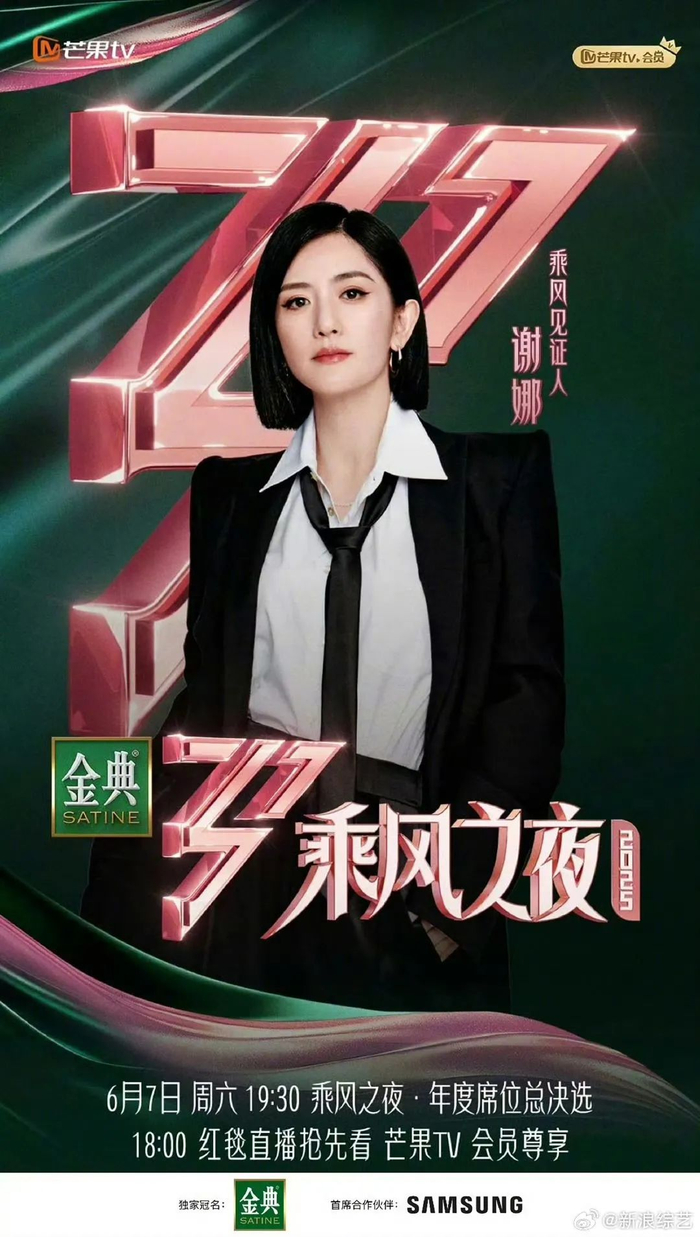 随后,《乘风2025》官方平台还发布了今晚的节目单;谢娜作为节目嘉宾,将演唱7曲串烧。