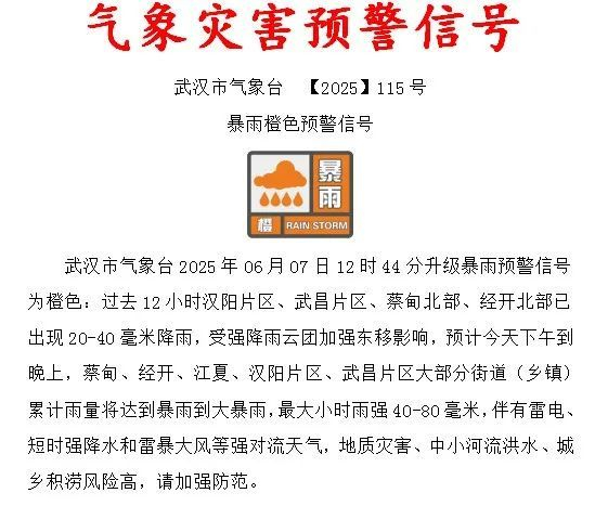 武汉市气象台2025年6月7日12时44分发布暴雨预警信号:过去12小时汉阳片区、武昌片区、蔡甸北部、经开北部已出现20-40毫米降雨,受强降雨云团加强东移影响,预计今天下午到晚上,蔡甸、经开、江夏、汉阳片区、武昌片区大部分街道(乡镇)累计雨量将达到暴雨到大暴雨,最大小时雨强40-80毫米,伴有雷电、短时强降水和雷暴大风等强对流天气,地质灾害、中小河流洪水、城乡积涝风险高,请加强防范。