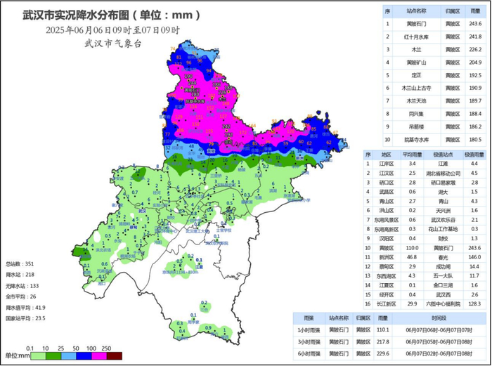 今天2时,强降雨云团开始影响黄陂、新洲西部和长江新区北部,已出现暴雨到大暴雨,截至9时累计雨量70—240毫米,其他地区阵雨或雷阵雨。共有22个街道(乡镇)66站超过50毫米,15个街道(乡镇)40站超过100毫米,最大累计雨量和最大小时雨强均出现在黄陂区长轩岭街道石门站,分别为243.6和110.1毫米(出现时间7日6—7时)。最大阵风为黄陂区蔡家榨街道艾馆站16.1m/s(7级)。
