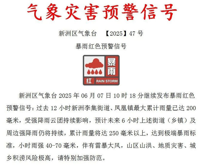 新洲区气象台2025年6月7日10时18分继续发布暴雨红色预警信号:过去12小时新洲李集街道、凤凰镇最大累计雨量已达200毫米,受强降雨云团持续影响,预计未来6小时上述街道(乡镇)及周边强降雨仍将持续,累计雨量将达250毫米以上,达到极端暴雨标准,小时雨强40—70毫米,伴有雷暴大风,山区山洪、地质灾害、城乡积涝风险极高,请特别加强防范。