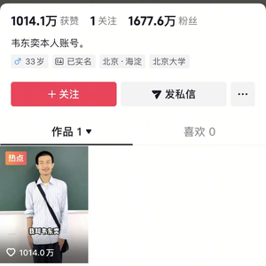 目前,该账号仅有1条4秒的出镜视频,是韦东奕的自我介绍,只有短短3句话,“大家好,我叫韦东奕,这是我的账号。”