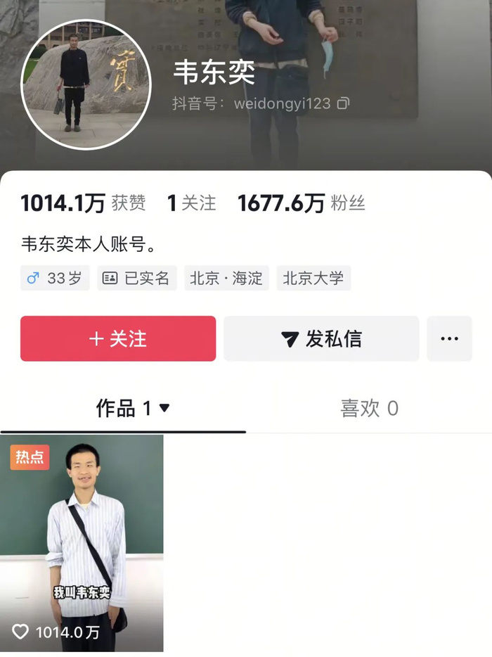 高考前夕,现正在北京大学任教的韦东奕老师、网友熟悉的“韦神”发布视频和网友打招呼,其个人简介标注为“韦东奕本人账号”。