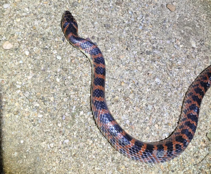 赤链蛇属于中小型蛇类,成体全长一般在80-150厘米之间,体色鲜艳,背部主要为黑褐色,与红(或红褐色)色相间,形成鲜明的对比,在野外非常有辨识度。