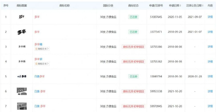 天眼查显示,“多半”“白象多半”“白象多半袋”以及“白象多半桶”等商标,大多在2018年至2021年间申请注册。