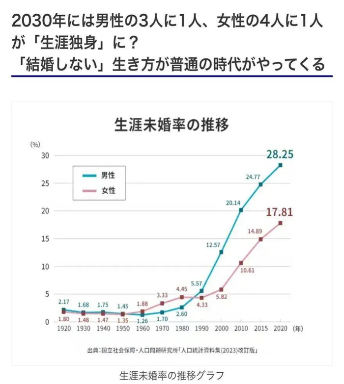而男性的“终生未婚率”也大幅提升,2015年,日本每4个男性中,就有1人一辈子不结婚的。预计在2030年,这个比例会提高到每3个男性就有1人将在没有婚姻经历的人生中孤独终老。