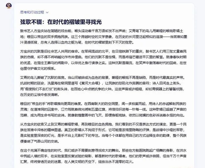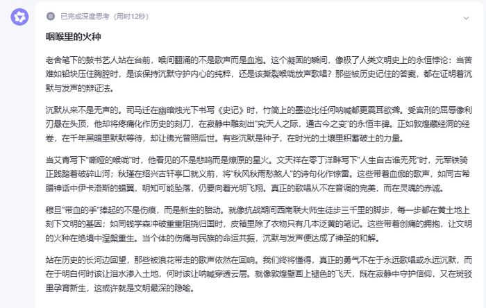 通篇来看,除了首尾段点题,DeepSeek还在文中每段层层递进地展开探讨了艺术对于困难者、对深陷泥泞的民族、对新生重建的民族、对历史与当下的作用。
