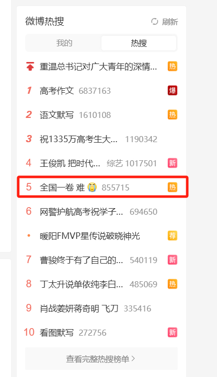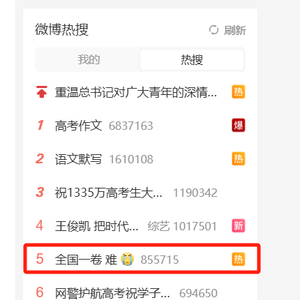 作为“首战”的语文考试结束不久,“高考作文”“作文 跑题”“全国一卷 难”的话题就被推上了微博热搜。