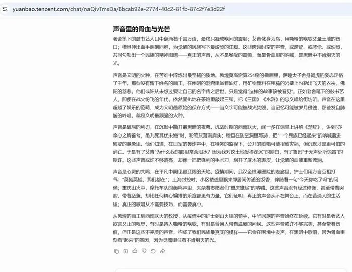 专家认为,腾讯混元作文立意精准、素材鲜活,但在部分段落过渡处稍欠自然,以及文章结尾处写到的 “中华民族的声音始终在延续” 稍显平面化、缺乏时代叩问。