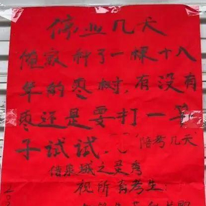 近日,山东济南一烤鸭店的陪考停业告示火了。老板在告示中称女儿为“18年的枣树”,幽默地写道:“俺家种了一个18年的枣树,有没有枣还是要打一竿子试试,陪考几天。”还借泉城之灵秀,以打油诗的形式向所有考生送去祝福。打油诗为:打赏妙笔生花似片鸭,思路流畅如甜酱,考的全会,“鸭”的全对。告示的内容既令人忍俊不禁,又倍感温馨。