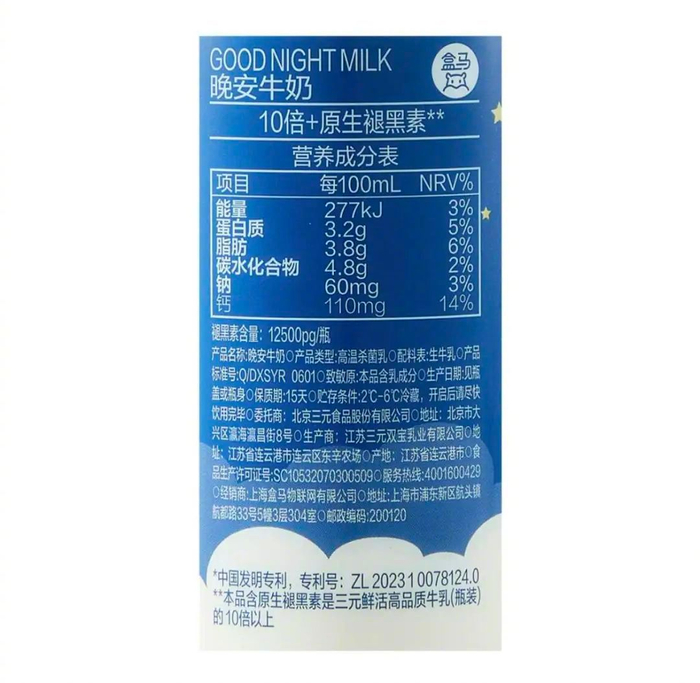 根据盒马APP商品介绍页面,该款牛奶产品配料表仅有生牛乳,瓶身标注着“10倍+原生褪黑素”(12500pg/盒),这一数据是将本品与三元鲜活高品质牛乳(瓶装)对照得出的。