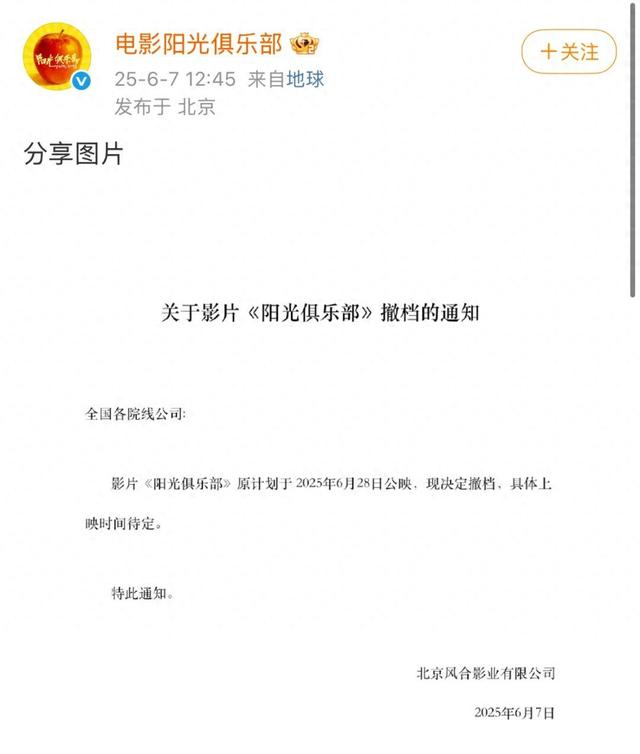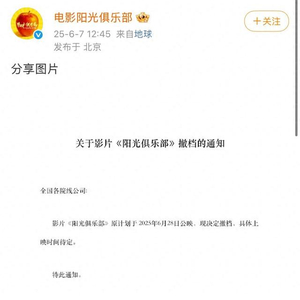 6月7日,电影《阳光俱乐部》发布撤档通知:影片《阳光俱乐部》原计划于2025年6月28日公映,现决定撤档,具体上映时间待定。