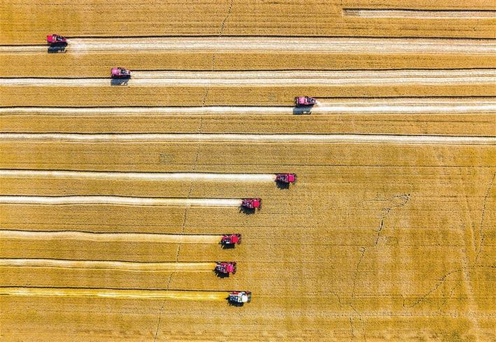 农业农村部数据显示,截至5月30日17时,全国已收获夏粮小麦面积1.29亿亩,收获进度已过三成。图为联合收割机在山西省运城市盐湖区解州镇曲村麦田里收割小麦。新华社发(薛 俊 摄)
