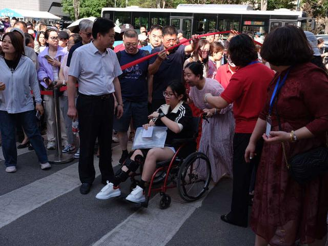 2025年6月7日,北京,对外经济贸易大学附属中学(北京市第九十四中学)门前,家长们拉开警戒线,为一名坐轮椅的考生让路。中青报·中青网记者 李隽辉/摄