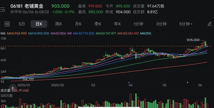 老铺黄金自2024年6月28日上市后,就开启“暴走”模式,目前股价相对发行价涨幅高达21.49倍。其股价在6月6日一举突破千港元,最高达到1015港元,成为目前港股中股价最高的股票,同时也是次新股中的“高价标杆”。