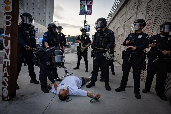6月6日,洛杉矶警察局清理街道,并检查一名倒地的男子。 视觉中国