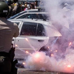 6月6日,示威者在洛杉矶大都会拘留中心外聚集,抗议ICE的突击搜查行动,警方动用防爆武器驱离示威者。 视觉中国