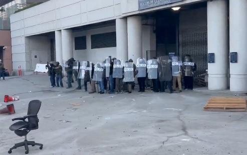 现场视频显示,数十名身穿绿色制服、戴防毒面具的安全人员在路上排成一排,周边散落着翻倒在地的购物车,小型爆炸气罐,烟雾弥漫。