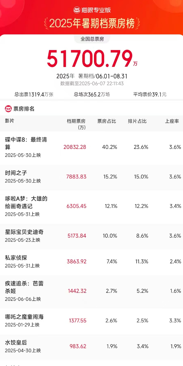 据猫眼专业版数据,截至6月7日22时,2025年暑期档总票房(含预售)破5亿元,《碟中谍8:最终清算》《时间之子》《哆啦A梦:大雄的绘画奇遇记》分列暑期档票房榜前三位。