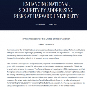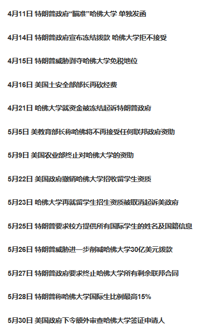 6月4日,特朗普又对哈佛大学加码实施限制措施。白宫文件称,将暂停或限制哈佛大学的学生和访问学者签证项目的参与资格;加强对与哈佛大学相关的外国学生和学者的审查,包括签证申请和在美活动的监督等等。