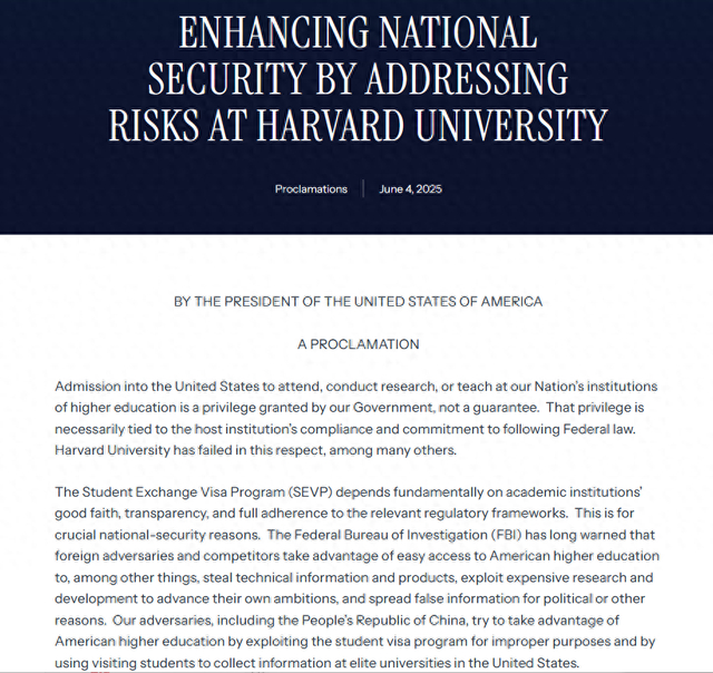 6月4日特朗普针对哈佛大学的最新签证限制,实质上目标还是中国。白宫网站
