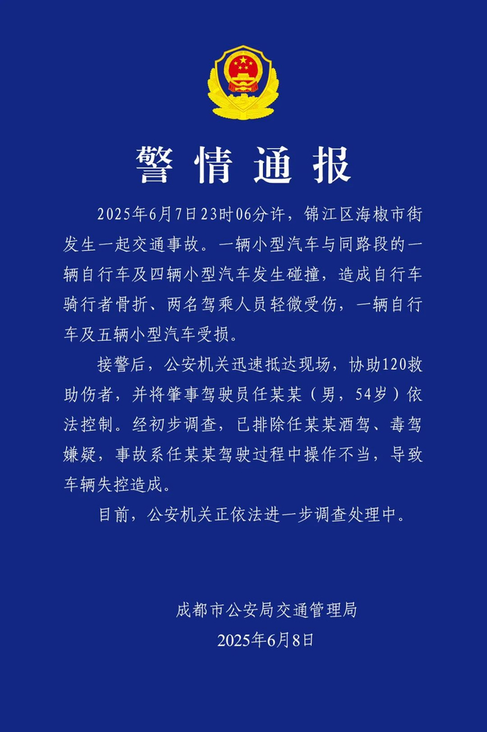 2025年6月7日23时06分许,锦江区海椒市街发生一起交通事故。一辆小型汽车与同路段的一辆自行车及四辆小型汽车发生碰撞,造成自行车骑行者骨折、两名驾乘人员轻微受伤,一辆自行车及五辆小型汽车受损。