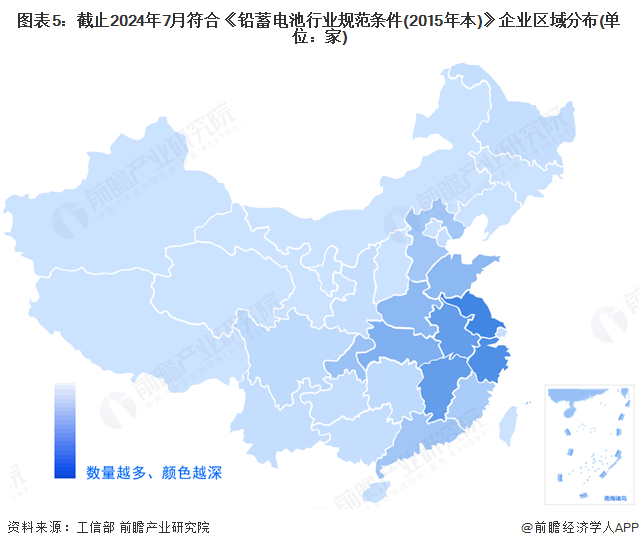 在区域发展方面,根据工信部2024年7月发布的符合《铅蓄电池行业规范条件(2015年本)》企业名单,当前132家符合《铅蓄电池行业规范条件(2015年本)》企业中,主要分布在华东和华中地区,江苏、浙江、安徽、江西、湖北等省市企业入选较多,分别有20、18、15和15家企业入选,合计占所有入选企业的比例为51.52%;其余省份均不超过10家。