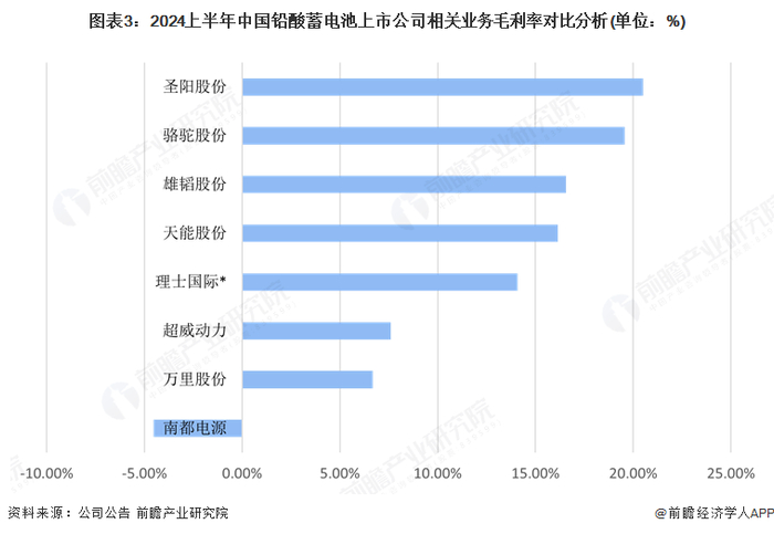 当前,天能股份和超威动力是国内铅酸蓄电池领先的制造企业,2024年上半年铅蓄电池业务营收规模分别为201.37亿元和126.58亿元;2024上半年骆驼股份、理士国际和南都电源的铅酸蓄电池业务营收也在25亿至75亿元不等,处于行业的第二梯队;其他企业的铅酸蓄电池业务半年营收规模普遍在10亿元以下。