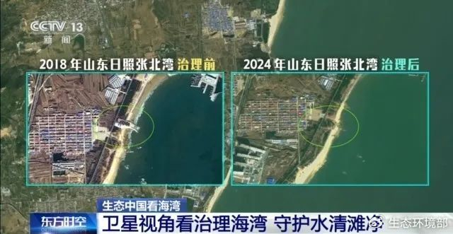 把好入海“闸门”,通过遥感影像对比,在山东日照张北湾,我们看到沿岸的非法排污口“消失”了。结合智慧管控系统等科技手段,现在,张北湾入海排污口整治率、达标率,近岸海域水质优良比例均为100%。