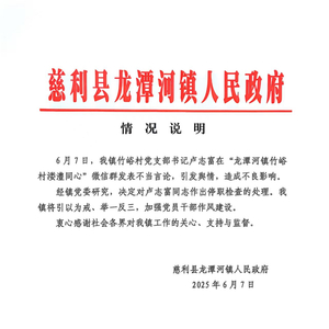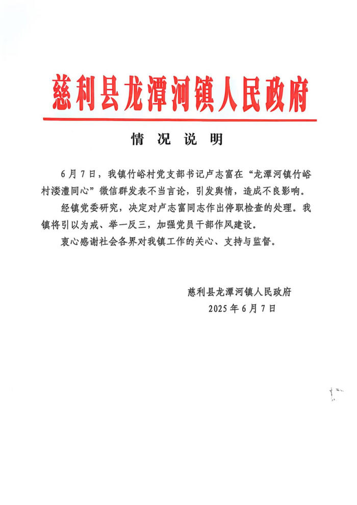 新京报讯 6月8日,湖南慈利县龙潭河镇政府发布情况说明,一村支书因在微信群发表不当言论,引发舆情,已被停职检查。