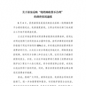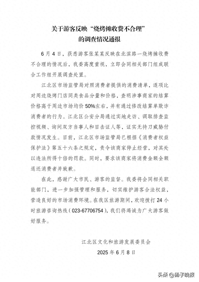 6月8日,重庆市江北区文化和旅游发展委员会就“游客反映烧烤摊收费不合理”一事发布调查情况通报: