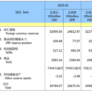 6月7日,国家外汇管理局统计数据显示,截至2025年5月末,我国外汇储备规模为32853亿美元,较4月末上升36亿美元,升幅为0.11%,已连续18个月稳定在3.2万亿美元以上。央行数据显示,5月末黄金储备为7383万盎司,环比增加6万盎司。