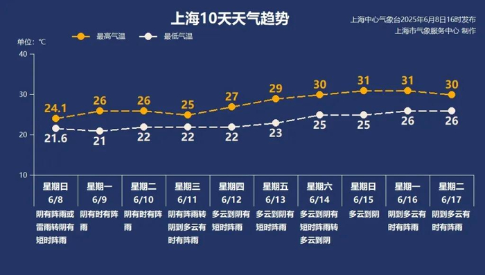 未来一周,梅雨带维持在长江中下游一带,并南北摆动,上海多降水过程。今年第1号台风可能于下周中期形成,从而影响上海降水。