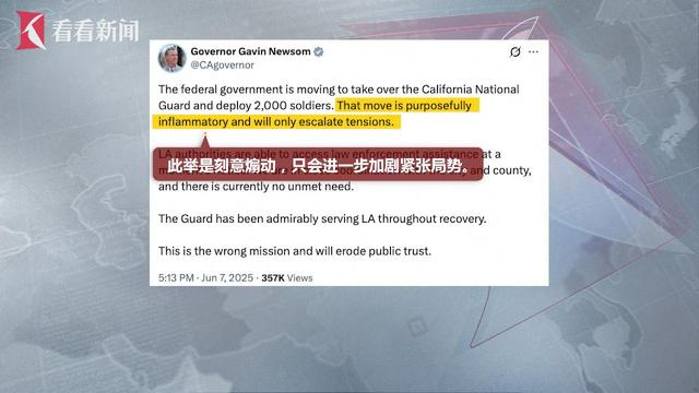加州州长纽森则迅速回应称,联邦政府正试图"接管加州国民警卫队",此举是"刻意煽动",将"进一步加剧紧张局势"。