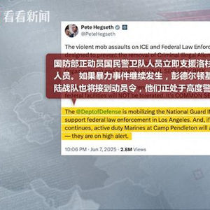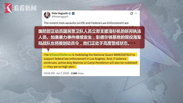 美国国防部长赫格塞思随后证实,国防部正动员国民警卫队人员落实相关命令,如果暴力持续,现役海军陆战队也将被动员,他们已处于高度警戒状态。
