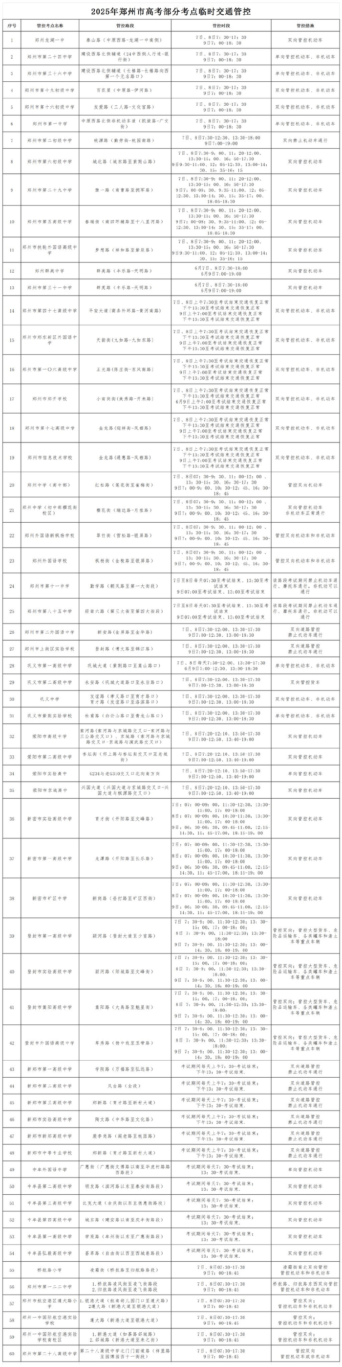 今年高考第三日(6月9日)恰逢周一工作日,早高峰与考生赶考时段重叠,考点周边道路交通压力大增。面对挑战,郑州交警采取多项针对性措施,保障考生顺利赴考,在此提醒出行市民避开考点附近道路。2025年高考郑州市60个考点临时交通管控注意避让。具体如下: