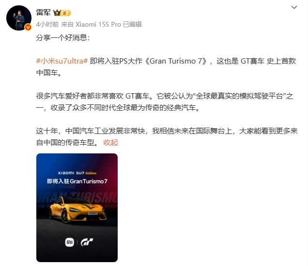 6月8日,小米创办人、董事长兼CEO雷军发文:小米SU7 Ultra即将入驻“GranTurismo 7”,这也是GT赛车史上首款中国车。