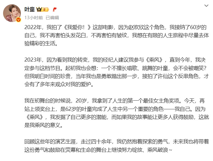 6月8日,知名女演员叶童发长文回应《乘风2025》夺冠:20岁,我拿到了人生的第一个最佳女主角奖项。今天,再站上领奖台上,是62岁的叶童完成了人生中另一个重要的角色——我自己。因为《乘风》,我发掘了自己更多的潜能,而如果我的故事能让更多人获得鼓励,这就是我乘风的意义。