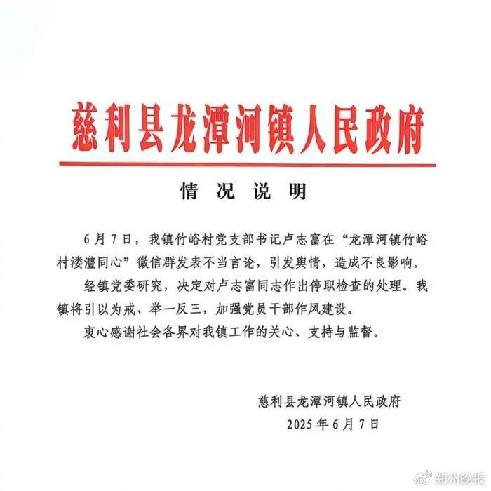 6月8日,湖南慈利通报“村支书威胁拍天坑垃圾要打”:村支书因在微信群发表不当言论,引发舆情,已被停职检查。