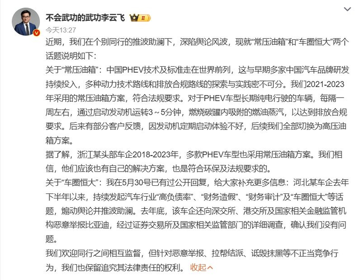 6月8日,比亚迪集团品牌及公关处总经理李云飞发文回应“常压油箱”和“车圈恒大”争议,称常压油箱方案符合法规要求,并已全部切换为高压油箱方案。同时,比亚迪表示河北某车企恶意举报,经调查确认没有问题。